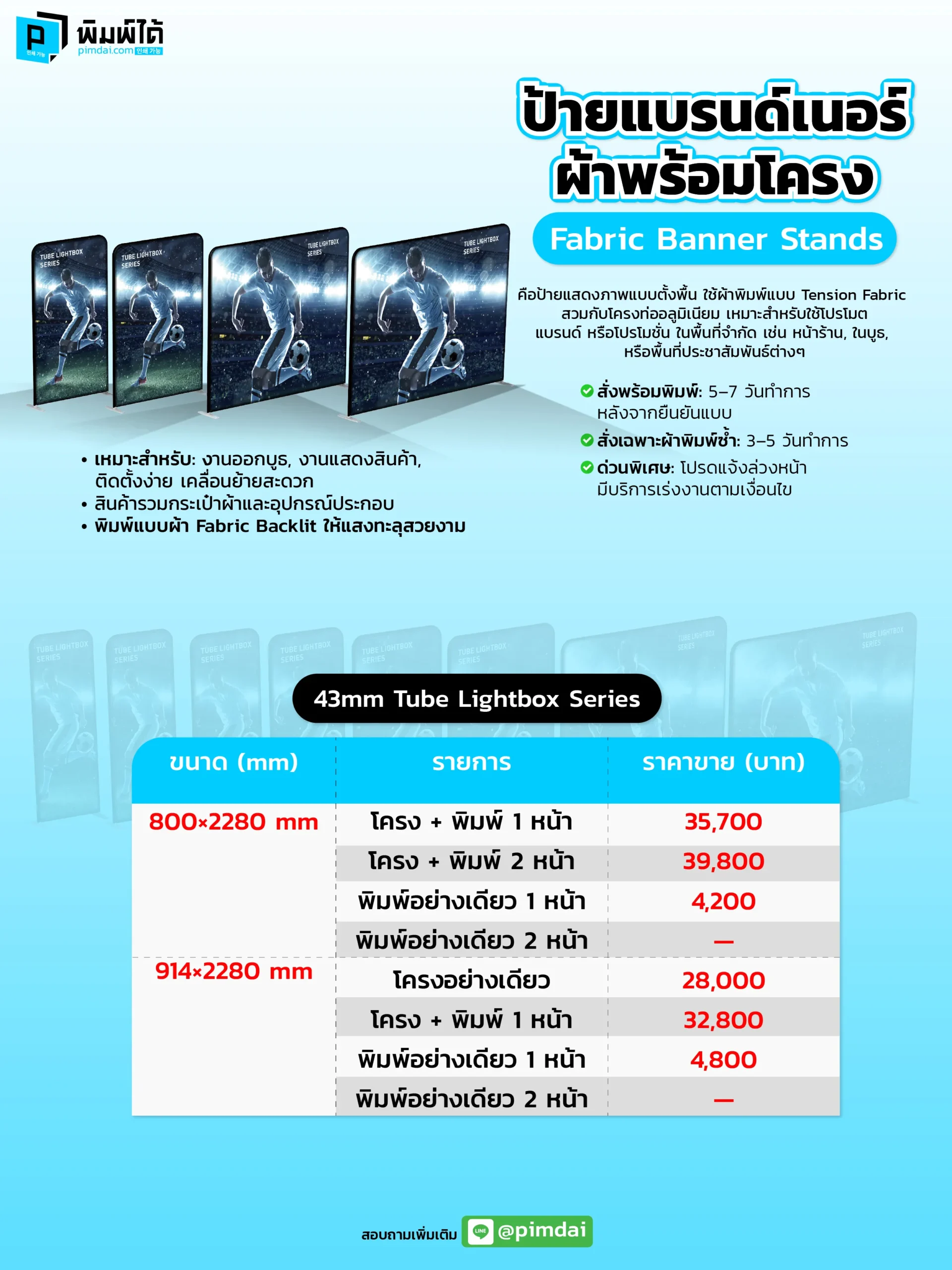 Pimdai เลือกใช้ ผ้าตึงไร้รอยต่อ (Tension Fabric) คุณภาพดี พิมพ์ด้วยระบบ Dye-Sublimation ที่ให้สีสันสดใส ความละเอียดสูง ทำให้ภาพแบรนด์ของคุณโดดเด่นและคมชัด ส่วนโครงสร้างเป็น อะลูมิเนียม ที่แข็งแรงแต่น้ำหนักเบา เหมาะกับการใช้งานทุกรูปแบบ