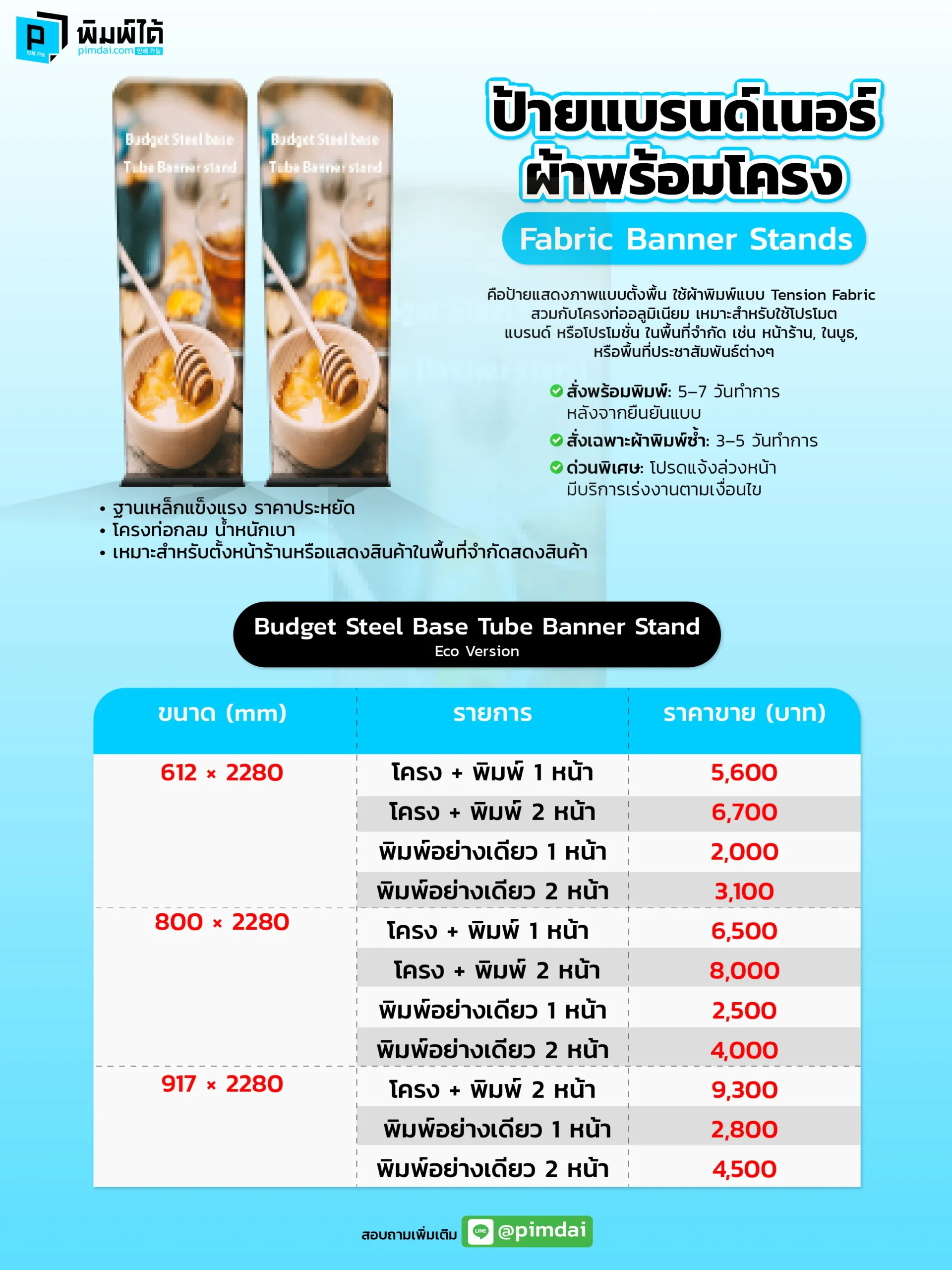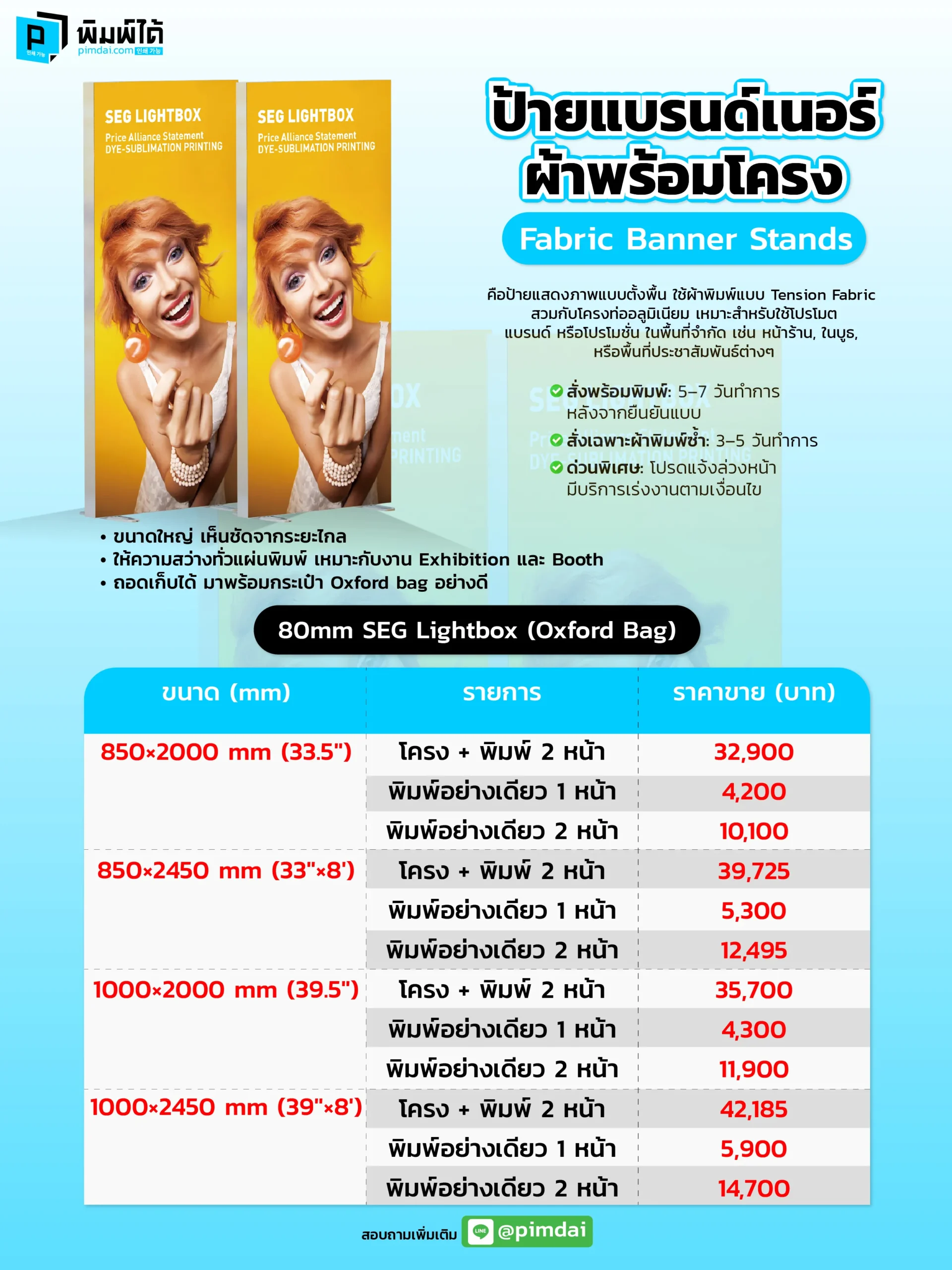 ป้ายแบรนด์เนอร์ผ้าพร้อมโครง Fabric Banner Stand คือป้ายแสดงภาพแบบตั้งพื้น ใช้ผ้าพิมพ์แบบ Tension Fabric สวมกับโครงท่ออลูมิเนียม เหมาะสำหรับใช้โปรโมตสินค้า แบรนด์ หรือโปรโมชั่น ในพื้นที่จำกัด เช่น หน้าร้าน, ในบูธ, หรือพื้นที่ประชาสัมพันธ์ต่างๆ