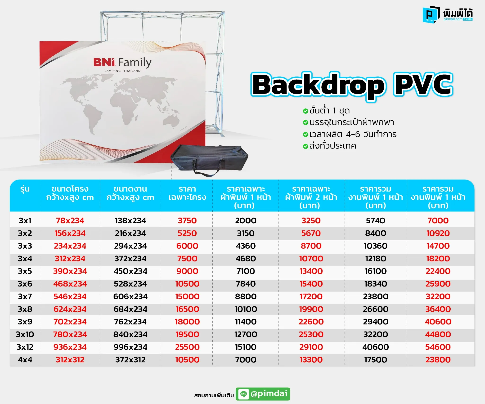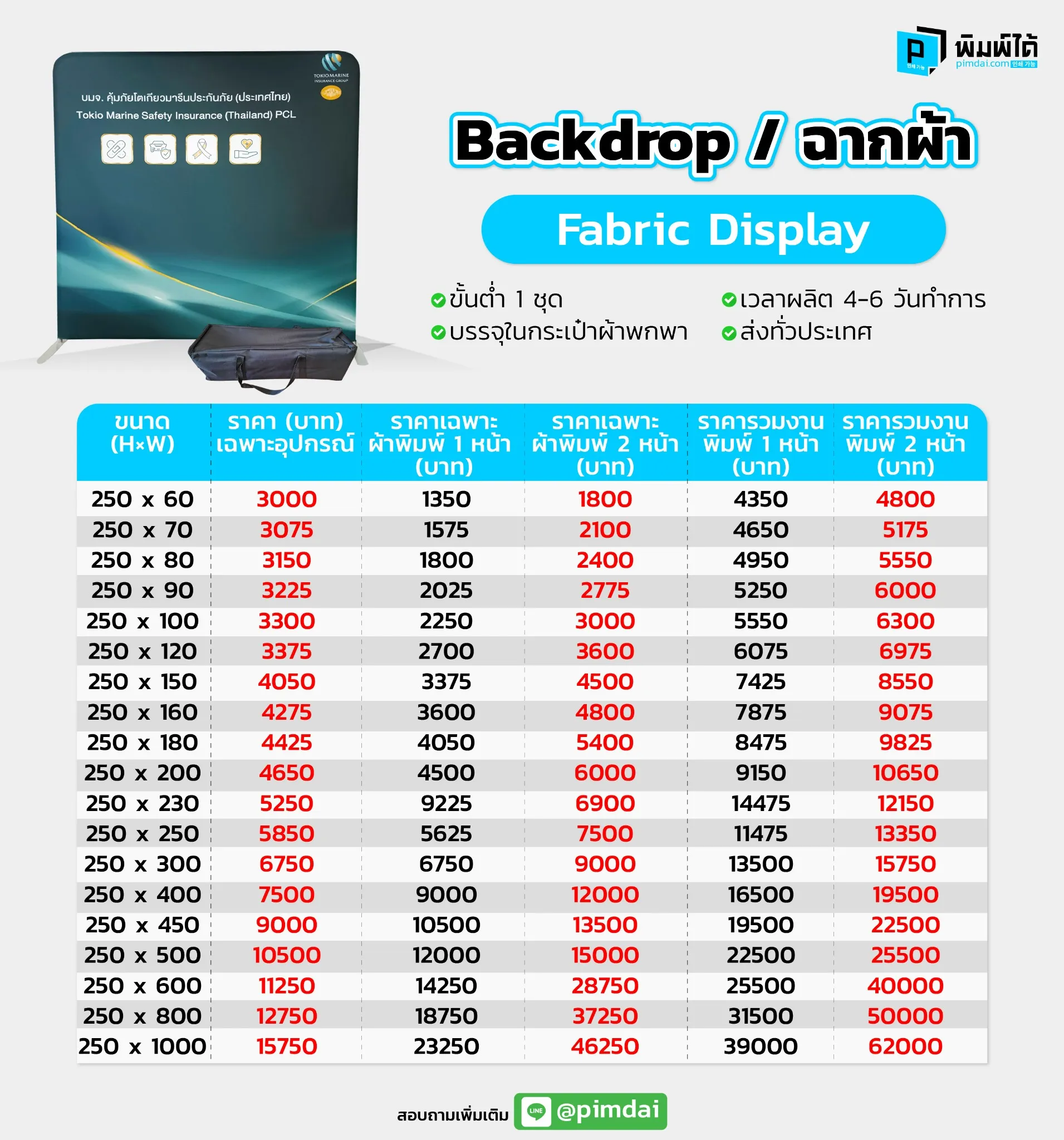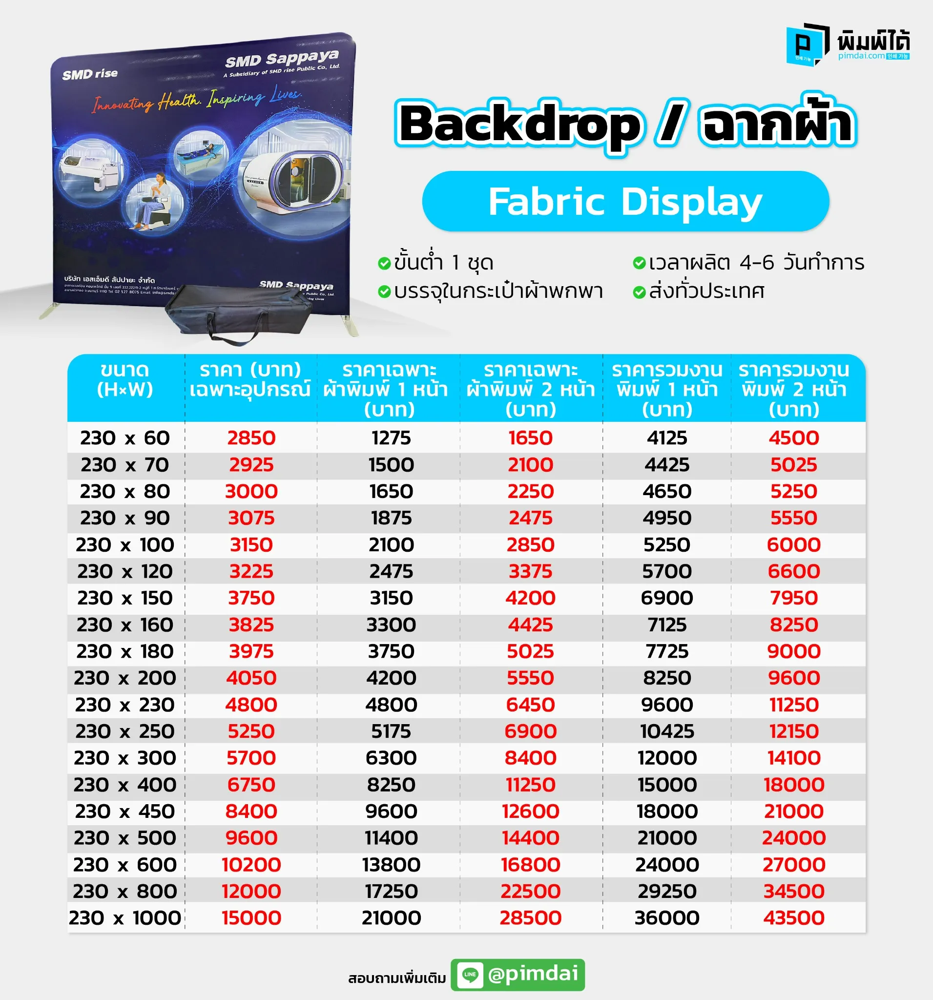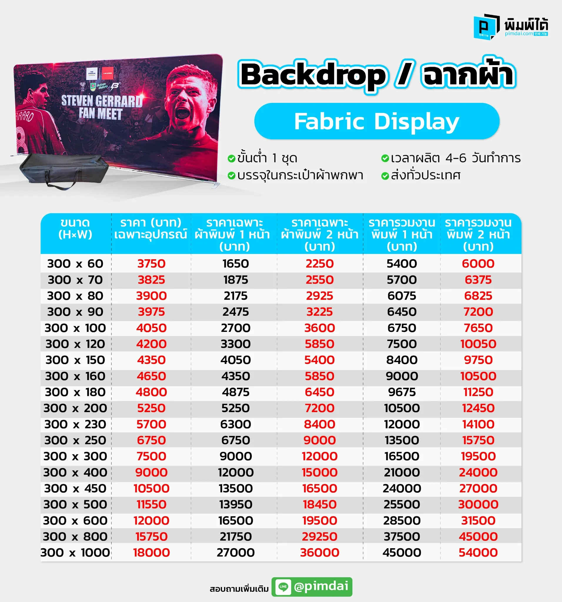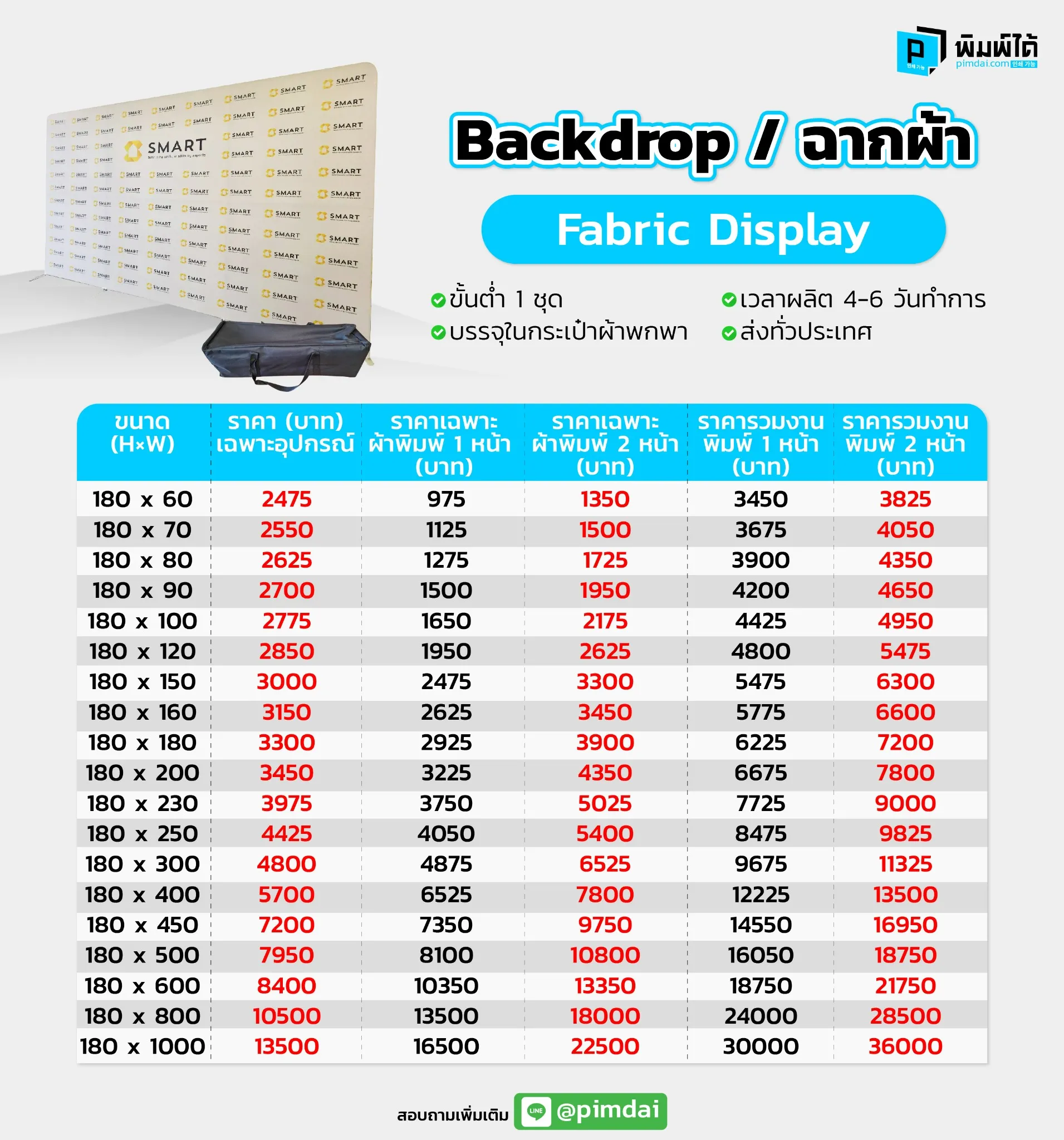 - ความสะดวกในการจัดเก็บ: ผ้าพิมพ์สามารถพับเก็บได้ง่ายและใช้พื้นที่น้อยกว่าการจัดเก็บแบ็คดรอปแบบอื่น ๆ