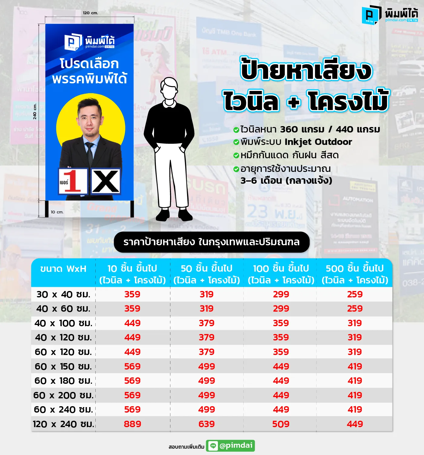 ผลิตที่ Pimdai.com จากวัสดุคุณภาพดีและผ่านกระบวนการพิมพ์ที่ถูกต้อง จะมีความทนทานต่อสภาพอากาศ รวมถึงฝนได้ดีในระดับหนึ่ง อย่างไรก็ตาม การโดนฝนเป็นเวลานาน หรือฝนตกหนัก อาจส่งผลต่อสีของป้ายได้เช่นกัน
