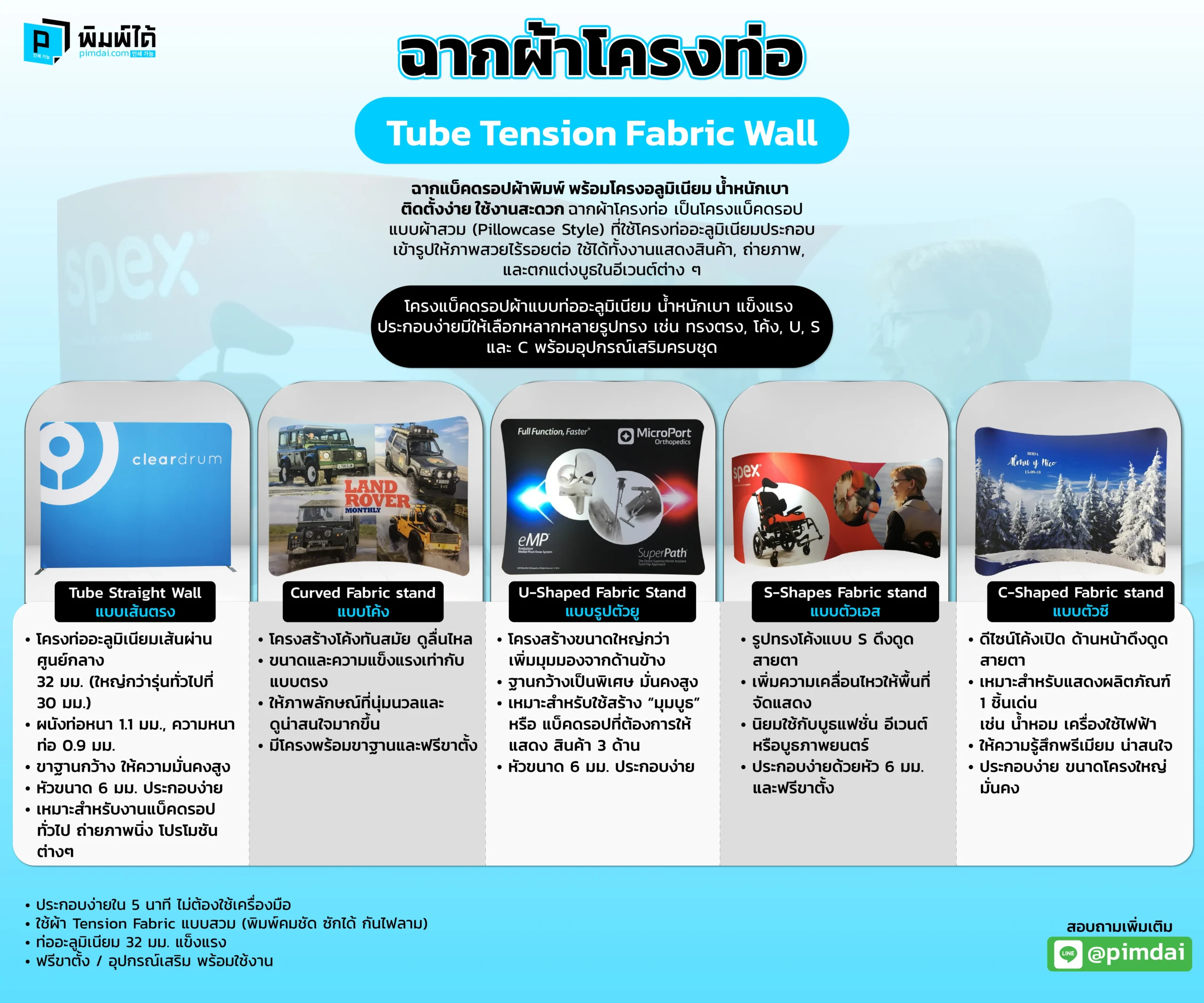 - ใช้ผ้า Tension Fabric แบบสวม (พิมพ์คมชัด ซักได้ กันไฟลาม)